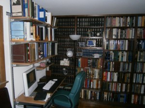 is the corner, where two walls of built-in floor to ceiling bookcases come together. I guess you could call that ground zero of the library.
