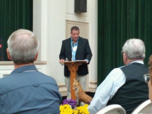 This photo is of the panel discussion at the end of the day on Saturday. Bud Hall is beside me, and because I was leaning forward to answer a question, he can’t be seen there. From left to right: Horace Mewborn, Bob Trout, Marshall Krolick, Jeb Stuart, IV, Bob O’Neill, me, Bud Hall (although you can’t see him next to me), Bruce Venter, and the fellow at the lectern is Childs Burden. If you want to see this photo (or the other two) in a larger version, just click on the photo.